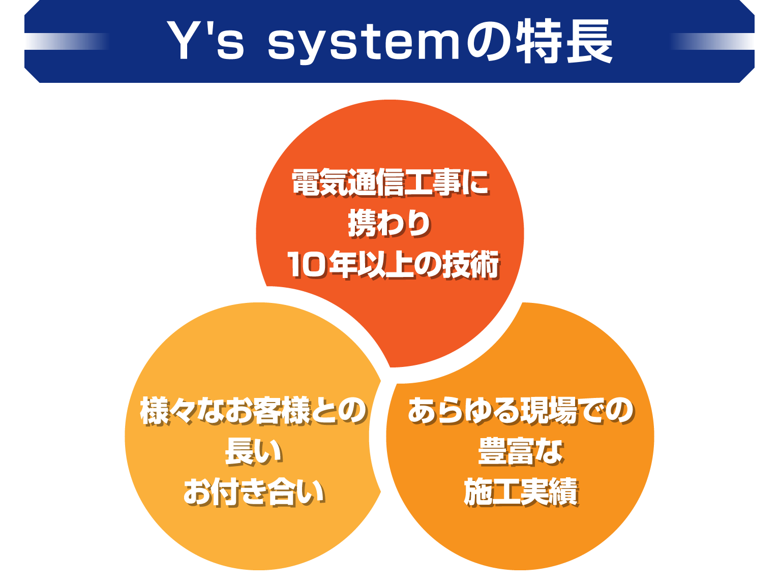 株式会社Y's systemは、大阪府堺市で電気通信工事を手掛ける会社です。創業から10年以上、大阪府を中心とした2府4県からのご依頼に対応してまいりました。マナーと施工品質、そしてスピードで、満足度の高い仕上がりをお約束いたしますので、まずはお問い合わせください。